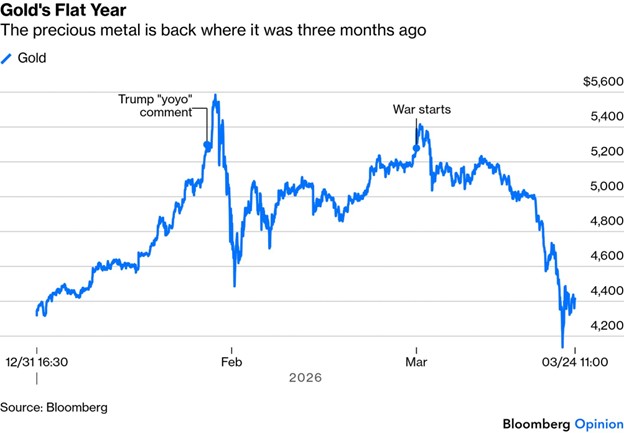 4. Despite being widely considered a hedge for times of crisis, the price of gold is down nearly 20% since the beginning of the war with Iran: