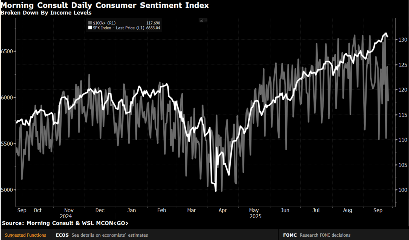 5. Over the past year, sentiment among high income earners has closely followed the stock market:
