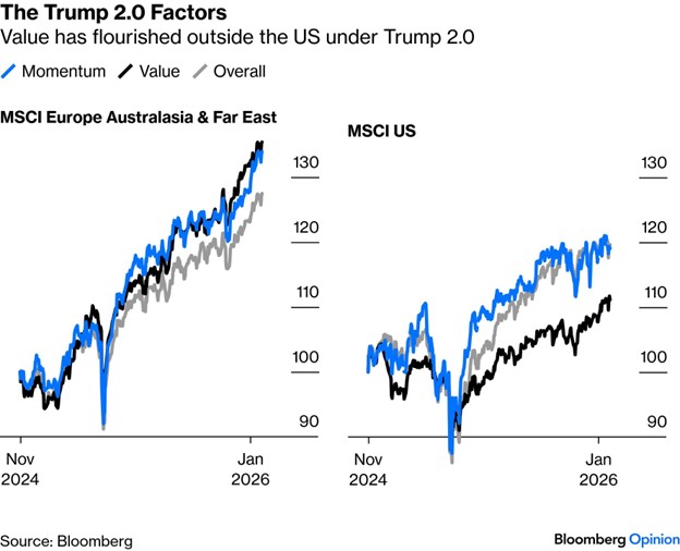 3. The value factor, which has disappointed U.S. investors for years, has worked in international markets as of late: