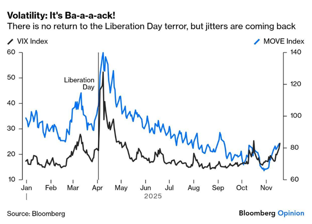 1. Volatility has returned to markets for the first time since Liberation day. Fears over AI excesses are now jockeying with the prospect of a Federal Reserve that increasingly wants lower rates.